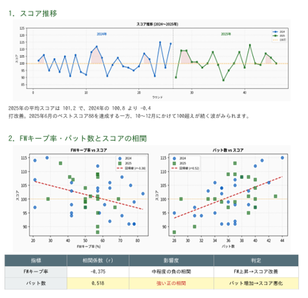 3.大叩きの回避: OB 3回以上の日は、どんなに他が良くても100を切るのが難しくなっています。ティーショットで少しでも不安があるホールは、番手を下げる決断がスコアに直結しそうです。