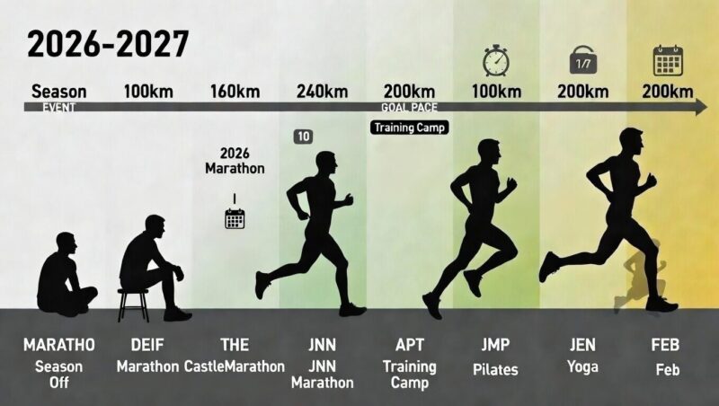 さて、4月からは、「2026-2027シーズン」の申込がはじまりますので、シーズン中のスケジュールを計画したいと思います。レースや合宿も組み合わせて、シーズンオフの月間100㎞の走行距離を月間200㎞まで上げていきます(10月は150㎞)。